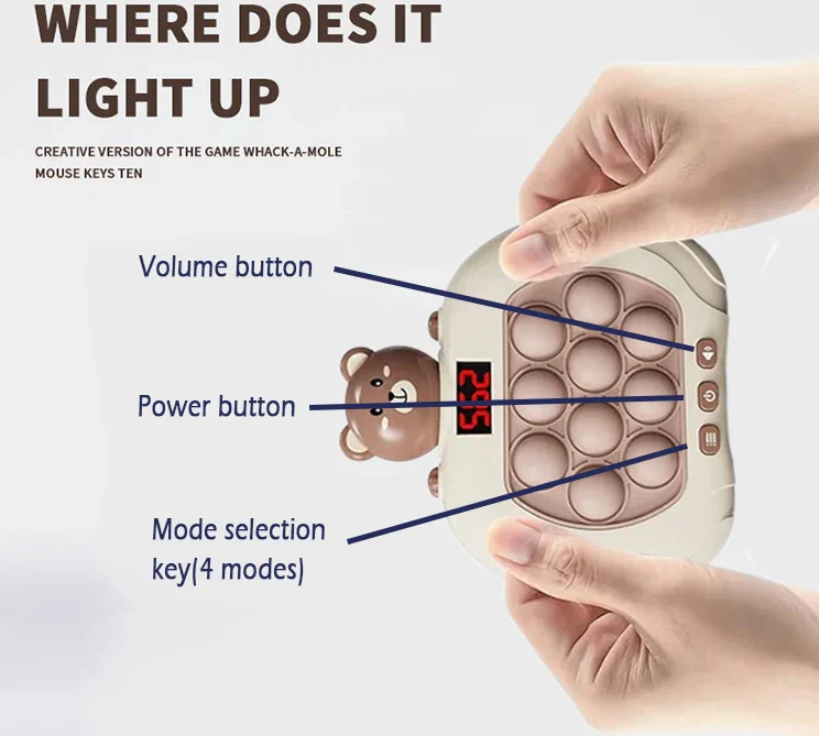 #Note!During the game, when you press the silicone bubbles, there may be a situation that the LEDs can not be turned off, you just need to touch your finger to the bottom of the silicone bubbles to make the LEDs go out. This is a normal phenomenon, because the LED is through the silicone bubble to push the switch on the PCBA board to turn off, if the bubble to push the switch on the PCBA board is too small strength will not be able to turn off the LED.Material: ABS + high quality siliconeMode: Breakthrough Mode, Memory Mode, Scoring Mode, Multiplayer Mode, Scoring Race, Breakout RaceLanguage: EnglishPackaging: Original box